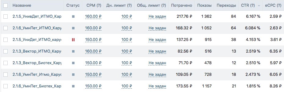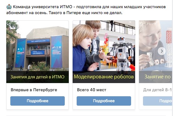 Дешевые клики с последующими записями показала аудитория выпускников ИТМО. Одно из занятий проводилось в этом университете, так что на первой карточке карусели была его фотография. Это объявление сработало лучше всех.