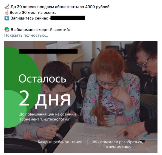 Занятия проводятся по выходным, продаются абонементами по 4-5 занятий одной тематики. В ходе кампании постоянно добавлялись новые абонементы, по которым нужно было заново тестировать аудитории и креативы. Это повышало цену клика.