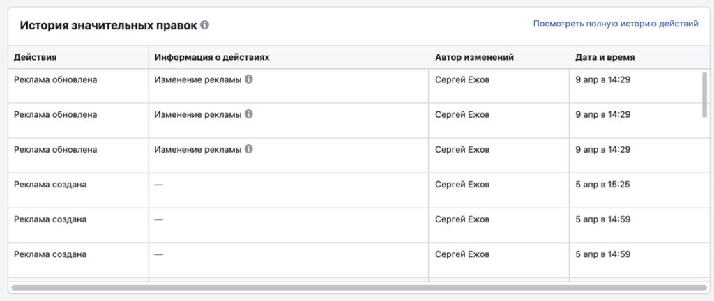 Ну и самая простая и понятная секция. Она показывает, кто вносил значительные правки в группу объявлений.