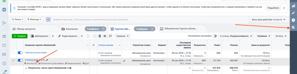 Чтобы в него попасть, на уровне группы объявлений найдите либо иконку с лупой с правой стороны экрана, либо ее же под названием группы.