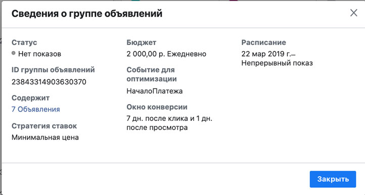 Если нажать на «Подробности» в верхнем правом углу, то мы увидим базовую информацию по группе объявлений. Тут никаких откровений, но просто удобно собрана базовая информация.