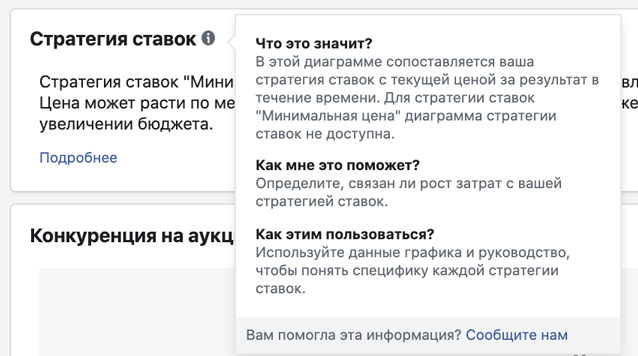 Эта секция покажет отношение между стратегией ставок и ценой за результат. Но доступна она только если мы используем стратегию, отличную от «Минимальной цены»