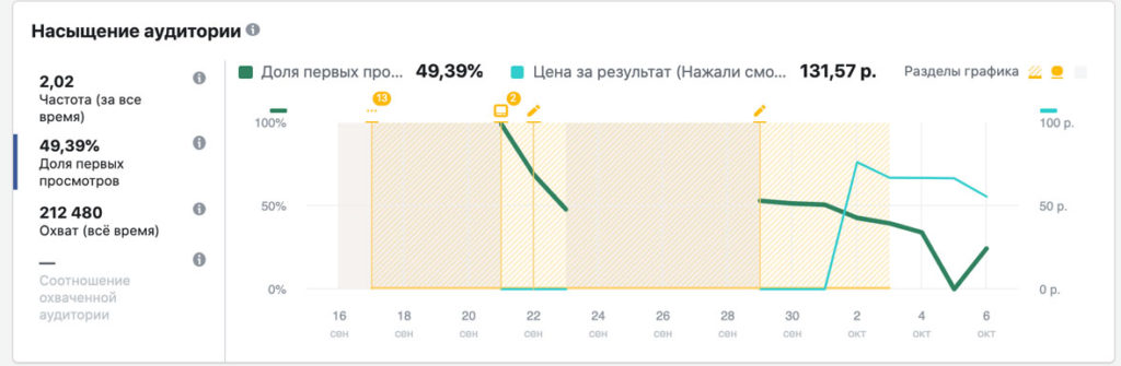 Но для меня интереснее посмотреть на то, видят ли новые пользователи наш тизер. Для этого слева нажмем на долю первых показов и линия на графике изменится.
