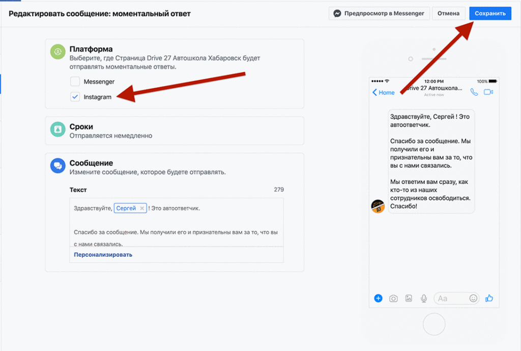 - В поле «Сообщение» прописываем то, что будет отправляться людям, которые нам написали. Тут можно использовать ссылки на Инстаграм аккаунты (Через @) и персонализировать сообщения. Допустим, добавить в него имя пользователя, к которому мы обращаемся.