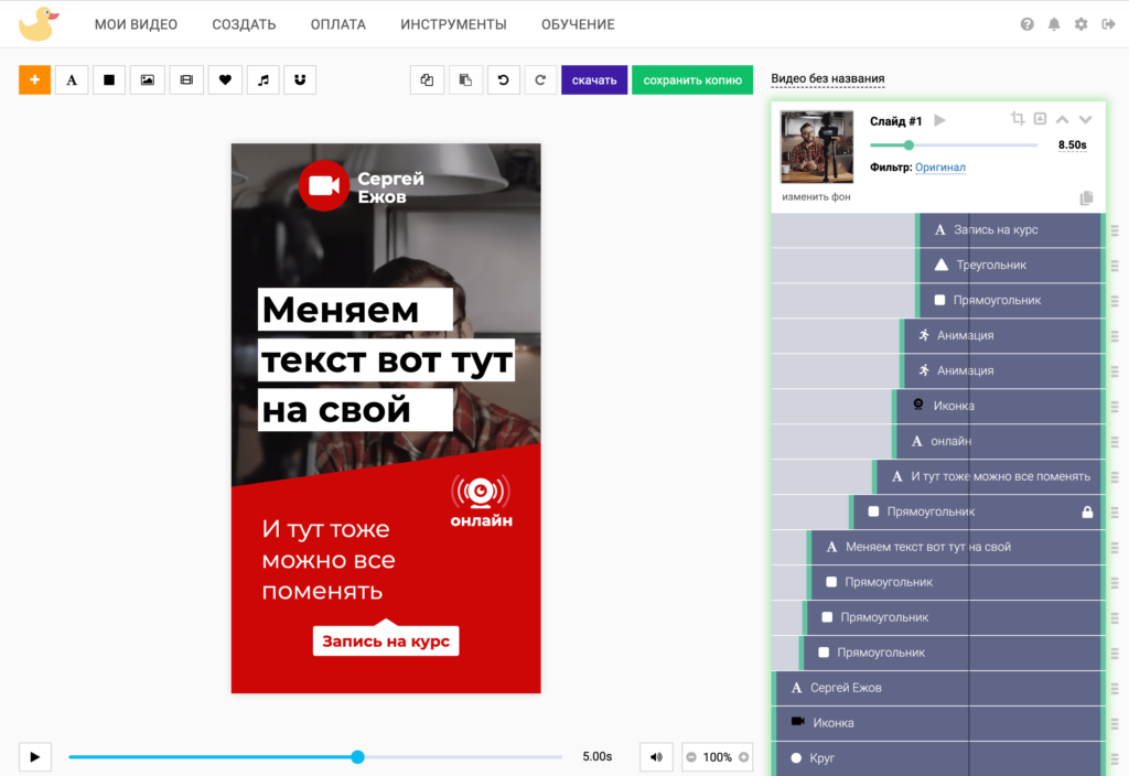 Нажимаем на нужные нам элементы и меняем их. Можно закинуть свои видео, фото и так далее. Все интуитивно и понятно.