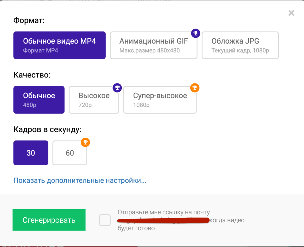 Выбираем параметры и нажимаем «Сгенерировать». Платная версия позволит вам выбрать качество получше и убрать логотип Supa с ролика.