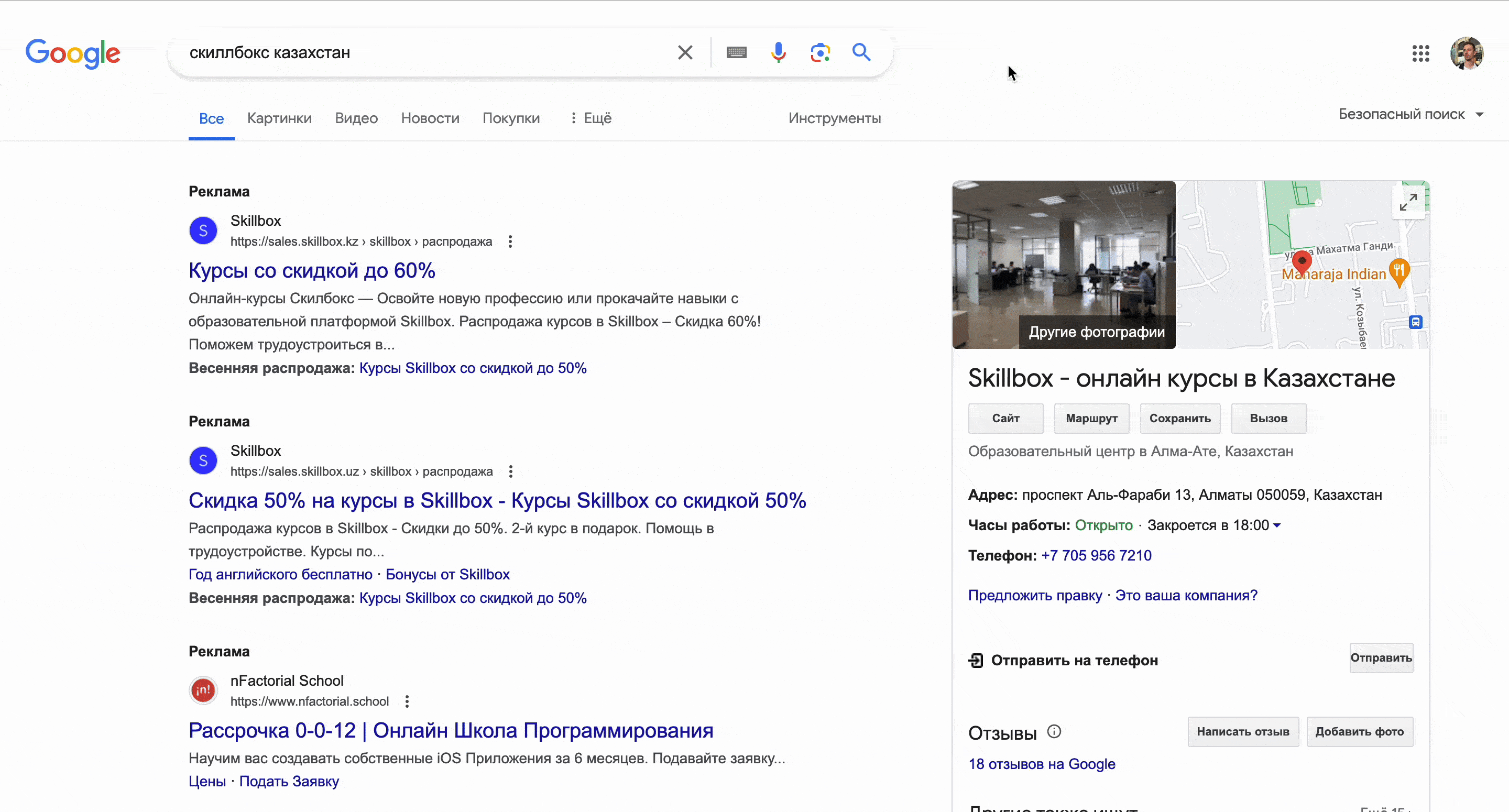 - Находим рекламу конкурента. Тупо по брендовому или любому другому запросу. Органическая выдача не подойдет, нам нужна именно реклама с соотвествующей плашкой