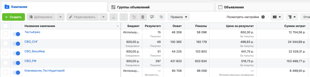 Берем 1-2 лучших аудитории из прошлого этапа и копируем их в новую кампанию. Можно в ее настройках выбрать оптимизацию бюджета на уровне кампании. Именно ее мы будем масштабировать, а тесты проводить в других кампаниях.