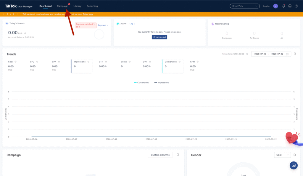 — Попадаем на дашборд. Тут будут все цифры по нашему рекламному кабинету, когда мы запустим рекламу. Пока он пустой, чтобы создать рекламу мы нажимаем «Campaign».