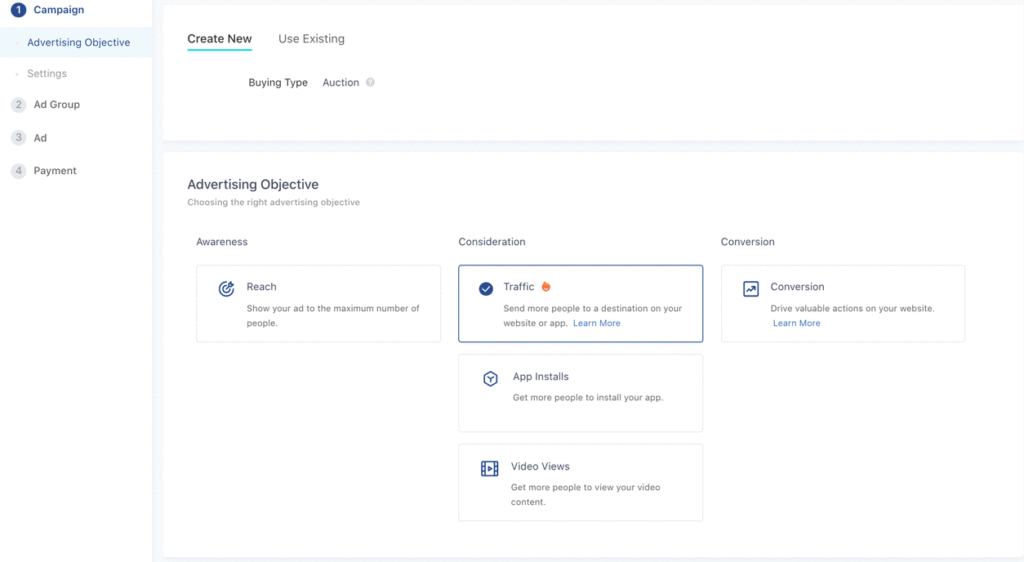 Первым делом при создании рекламной кампании нам, как и в Фейсбуке, надо выбрать ее цель. Пока доступны цели: охват, трафик, установки приложений, просмотры видео, конверсии. Для примера я выберу цель трафик, так как скорее всего вы будете работать с ней.