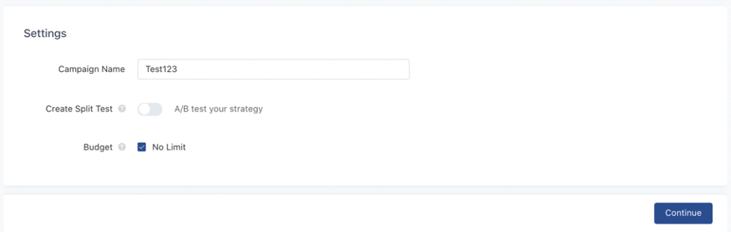 — Внизу прописываем название кампании и переходим дальше. Если снять галочку около «Budget», то можно задать лимит затрат на кампанию.