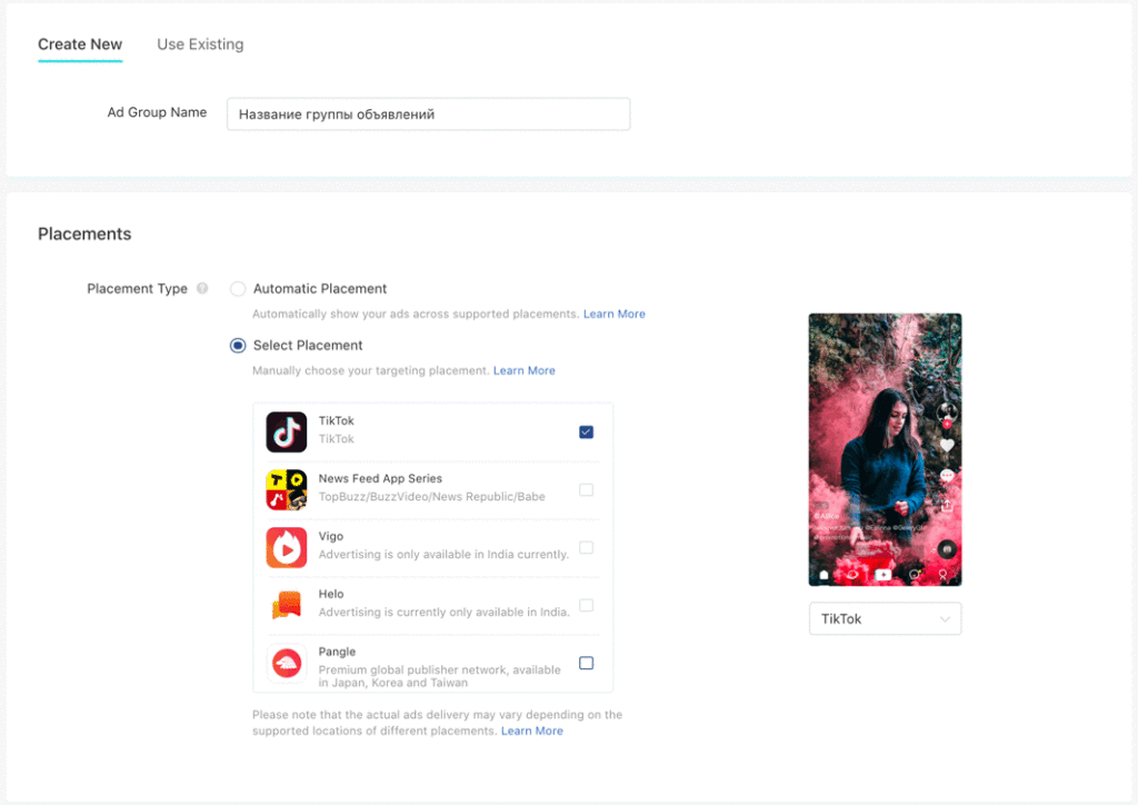 — Сначала вводим название группы объявлений. Ниже выбираем плейсмент, то есть место показа. Из всей рекламной сети TikTok, нас интересует только сам TikTok. Остальные приложения у нас либо не работают, либо не популярны.