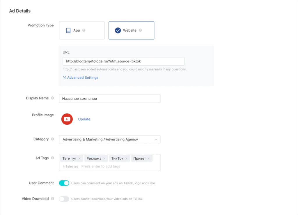 В поле URL рекомендую указывать ссылку сразу с UTM меткой, если вы их используете. Метку можно указать и ниже, но лично у меня негативный опыт с подобными решениями. Иногда они не срабатывали и трафик шел не размеченный.