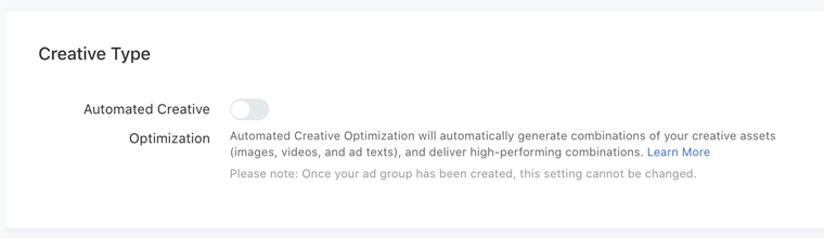 — Ниже идет поле «Creative type». Я не использую и даже не пробовал. По идее с этой функцией система должна будет автоматически сгенерировать все комбинации видео/текстов, которые вы загрузите, после чего протестировать эти объявления и оставить только лучшие. Предпочитаю делать это вручную.