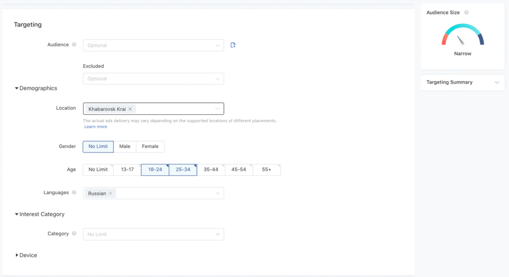 У ТикТока еще не много информации об интересах, его пиксели стоят не на каждом сайте, да и аудитории банально мало. Если мы выбираем интерес и делаем рекламу на отдельный регион, то слишком сужаем себе охват. Рекомендую не выбирать интерес, если вы продвигаетесь в конкретном городе или регионе. Если по всей стране — можно.