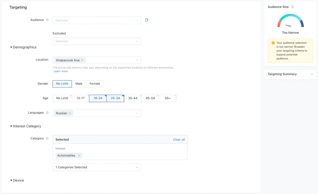 Вот тут мы выбрали интерес и слишком сузили аудиторию, система начала ругаться. Не рекомендую так делать.