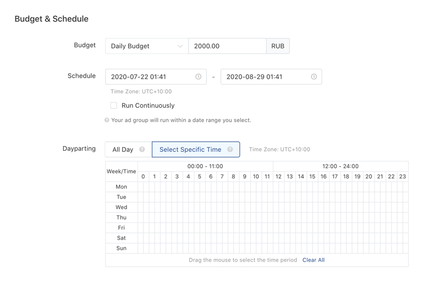 Там где «Dayparting» мы выбираем график показа рекламы. Можно оставить «All day» и она будет показываться весь день. Это можно быть полезно, если вы не можете обрабатывать заявки весь день, а до утра они не доживут в вашем проекте