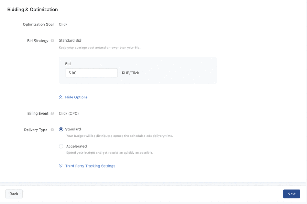 В блоке «Bidding & Optimization» мы выбираем настройки ставок и оптимизации