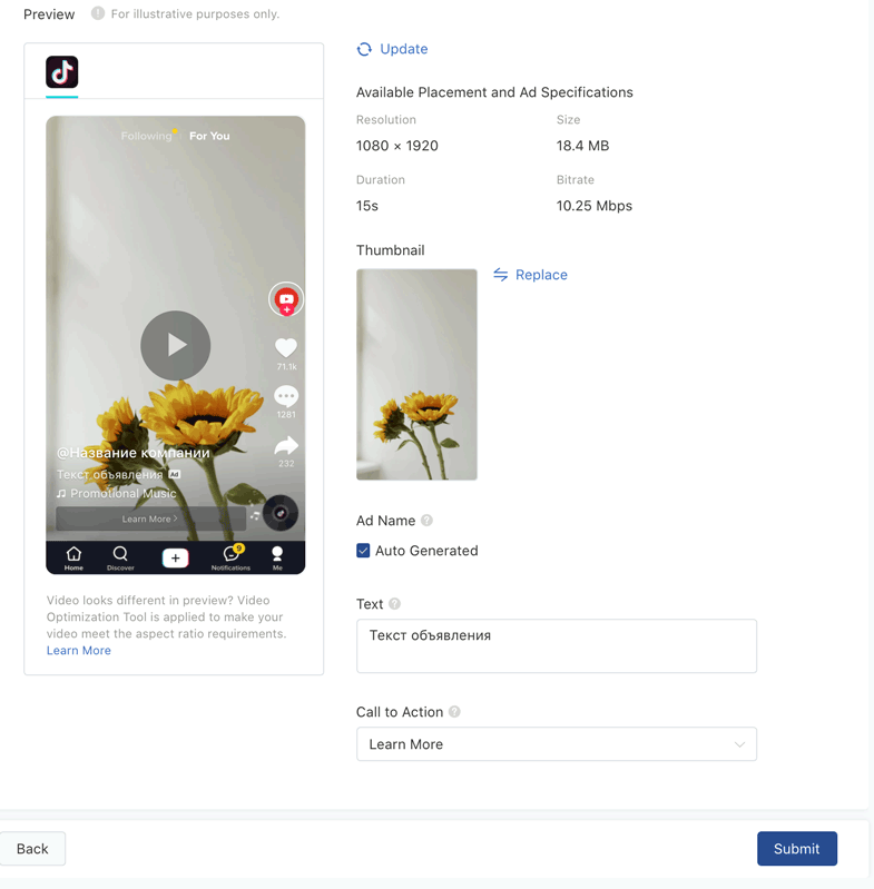 Если при монтаже видео вы наложили текст, то старайтесь не делать этого в нижней части ролика. Внизу будет текст объявления, который накладывается системой. Если текст объявления и текст на видео будут наслаиваться, то такой ролик могут не пропустить на модерации из-за нечитаемости