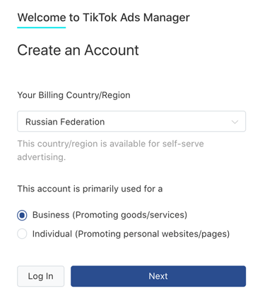 — Видим окно создания аккаунта. Выбираем страну и тип аккаунта. Идем далее.