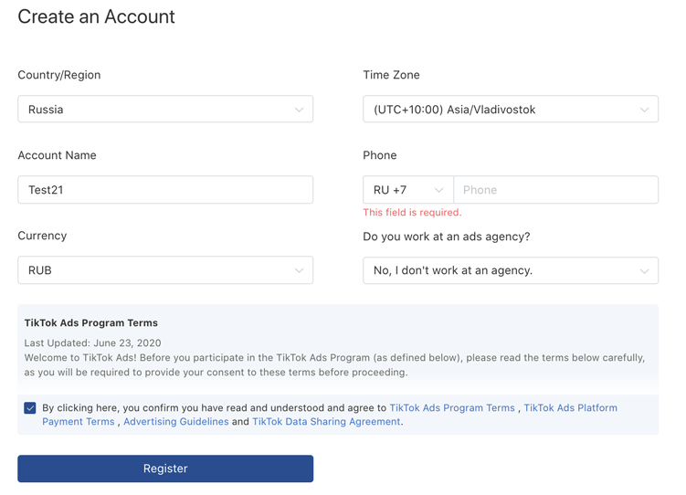 — Попадаем на последнее окно при создании кабинета. Выбираем страну, часовую зону, вводим название аккаунта, телефон для связи. Выбираем валюту и отвечаем, работаем ли мы в рекламном агентстве. Нажимаем кнопку «Register» и попадаем в сам рекламный кабинет.