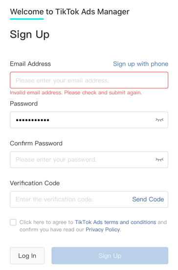 — Вводим емейл, либо телефон. Если телефон, то нажимаем на «Sign up with phone». Потом 2 раза вводим пароль, нажимаем на «Send code» и в последней строке вводим код, который придет на емейл или смской. Соглашаемся с правилами, идем далее.