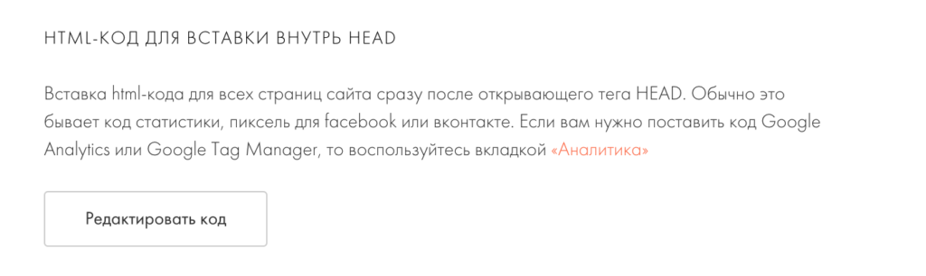 Ищем там «HTML-код для вставки внутрь head». Нажимаем «Редактировать код»