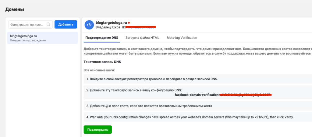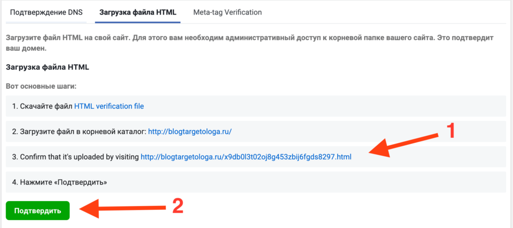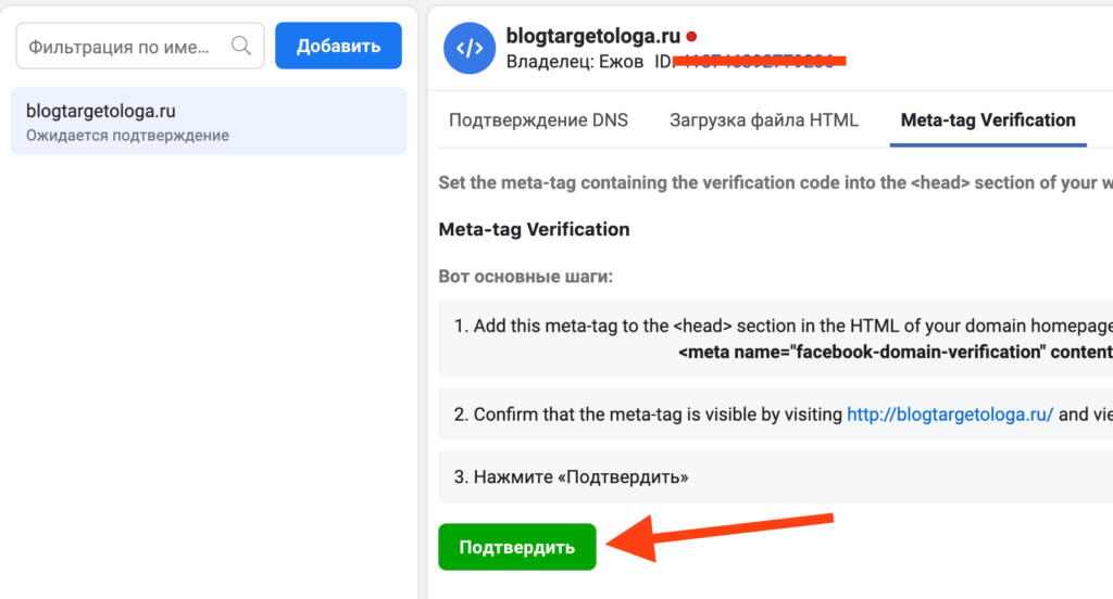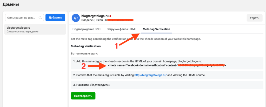 Снова переходим на Фейсбук. Нажимаем «Meta-tag Verification«