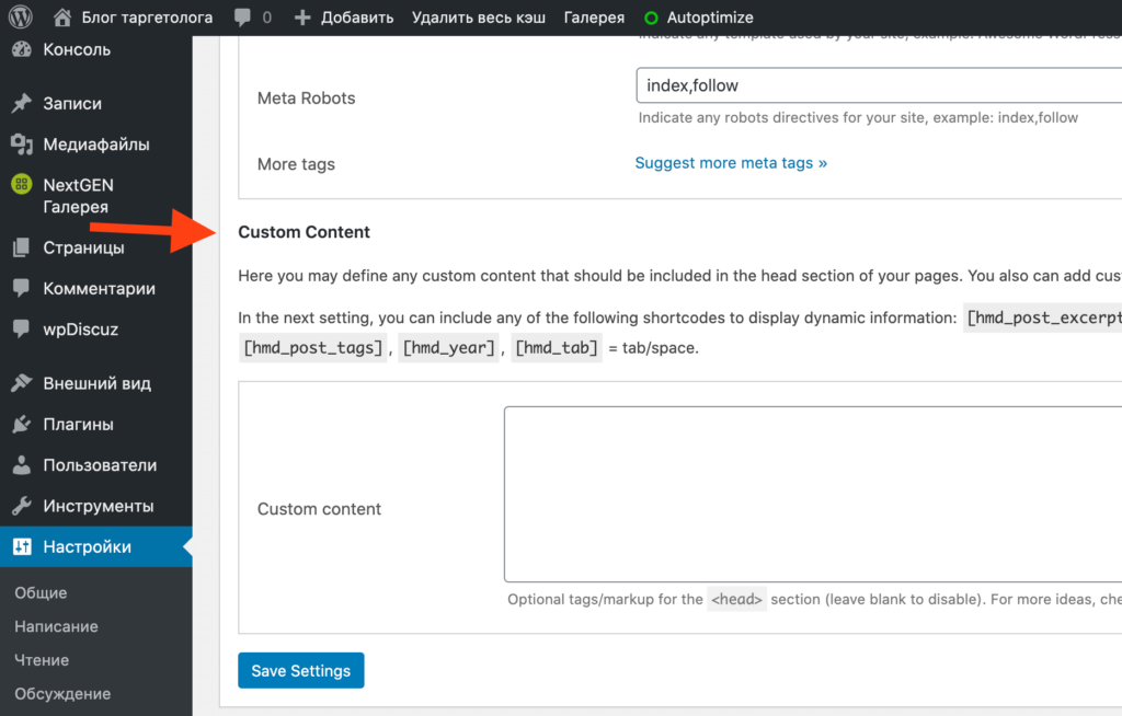 Мотаем в самый низ. Ищем поле «Custom Content«
