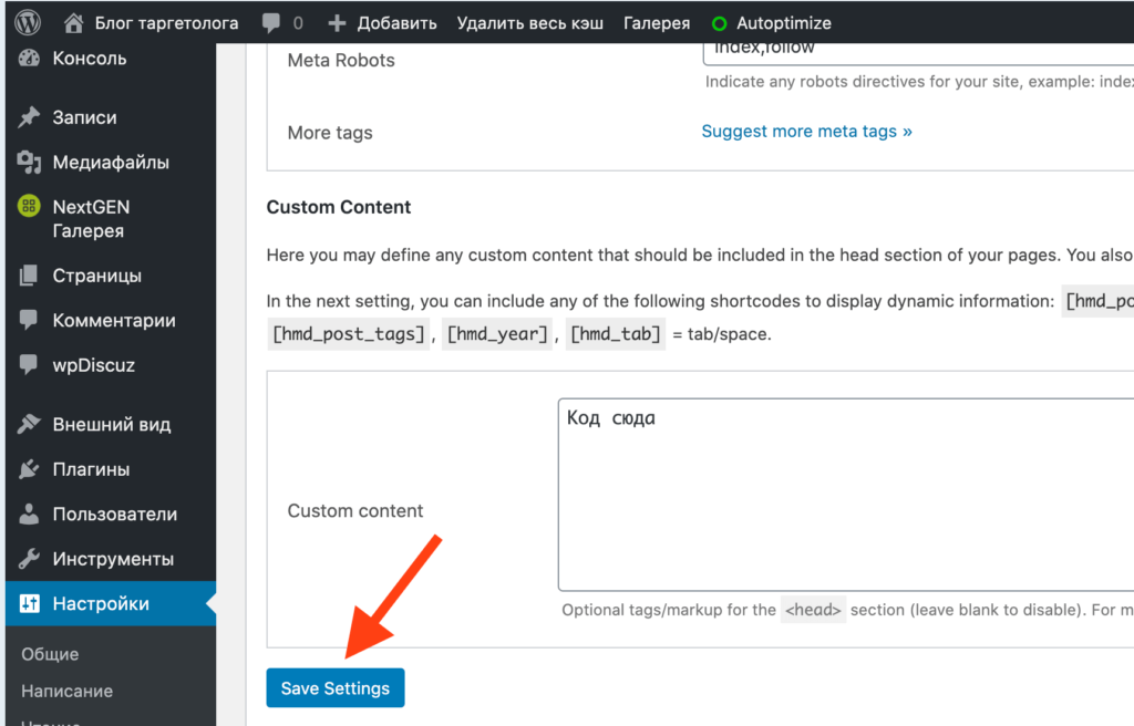 Копируем код под цифрой 2. Добавляем его в плагин на Вордпрессе. Нажимаем Save Settings.