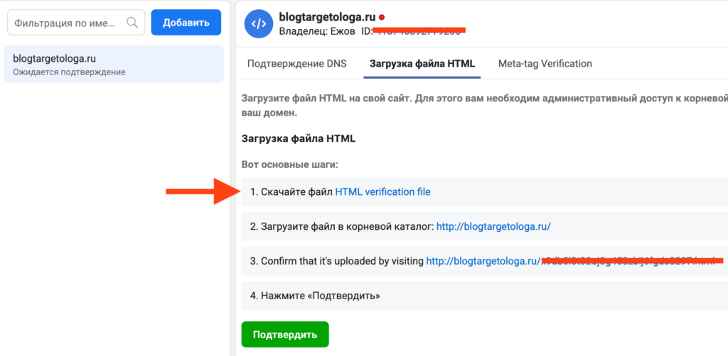 Переходим в Фейсбук. Нажимаем «Загрузка файла HTML». Скачиваем файл