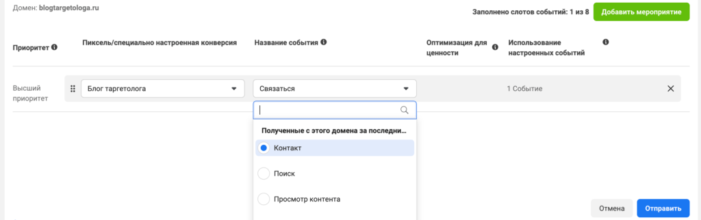 Нас ограничивают 8-ю событиями на домен. Так что сначала определите те события, которые вас наиболее приоритетны.