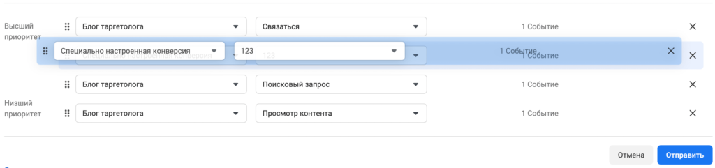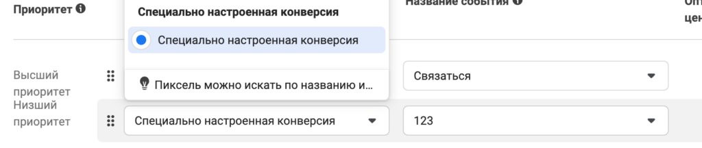 Специальные конверсии добавить тоже можно. Сначала в левом столбце проматываем все пиксели и выбираем «специально настроенная конверсия», затем в правом столбике выбираем саму конверсию.